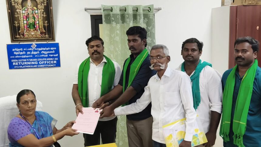 வருகின்ற 2026 சட்டமன்றத் தேர்தலை முன்னிட்டு தூத்துக்குடி மாவட்டம் விளாத்திகுளம் சட்டமன்ற தொகுதியில் போட்டியிடும் நாம் தமிழர் கட்சி வேட்பாளர் பாலாஜி வேட்பு மனு தாக்கல் செய்வதற்காக, விளாத்திகுளம் ஆற்றுப்பாலத்தில் இருந்து ஏராளமான நாம் தமிழர் கட்சியினருடன் விவசாயிகளின் அடையாளமான மாட்டு வண்டியில் ஏர் கலப்பையை சுமந்தவாறு தாரை தப்பட்டை அடித்து ஆரவாரத்துடன் ஊர்வலமாக விளாத்திகுளம் வட்டாட்சியர் அலுவலகம் நோக்கி வந்தனர்.