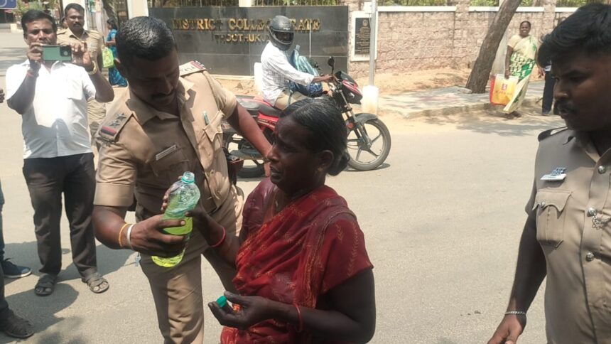 தூத்துக்குடி மாவட்ட ஆட்சியர் அலுவலக வளாகத்தில் பெண் தீக்குளிக்க முயன்றதால் பரபரப்பு ஏற்பட்டது. தூத்துக்குடி மாவட்ட ஆட்சியர் அலுவலகத்தில் இன்று காலை மக்கள் குறைதீர்க்கும் நாள் கூட்டம் நடைபெற்றது. அ்பபோது, வல்லநாடு கீழத்தெரு கோமு மனைவி சரஸ்வதி (55) என்பவர் ஆட்சியர் அலுவலகத்தில் மனுவுடன் வந்தார். அப்போது அவர் திடீரென தான் மறைத்து கொண்டு வந்த பாட்டிலில் இருந்த மண்ணெண்ணெயை தனது உடலில் ஊற்றி தீக்குளிக்க முயன்றார்.