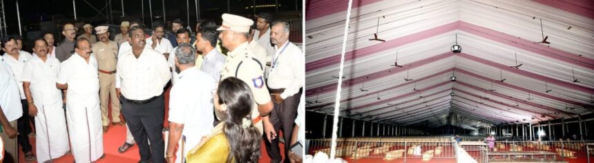 மாண்புமிகு தமிழ்நாடு முதலமைச்சர் அவர்கள் 12.09.2025 அன்று கிருஷ்ணகிரி அரசு ஆடவர் கலைக்கல்லூரி வளாகத்தில் நடைபெறும் நிகழ்ச்சியில் புதிய திட்டப் பணிகளுக்கு அடிக்கல் நாட்டி முடிவுற்ற பணிகள் துவக்கி வைத்தல் மற்றும் பயனாளிகளுக்கு அரசு நலத்திட்ட உதவிகள் வழங்க உள்ளதையடுத்து மேடை, பந்தல் அமைக்கும் பணிகள் மற்றும் அரங்குகள் அமைக்கும் பணிகளை மாண்புமிகு உணவு மற்றும் உணவுப்பொருள் வழங்கல் துறை அமைச்சர் அர. சக்கரபாணி அவர்கள் இரவு நேரில் பார்வையிட்டு ஆய்வு மேற்கொண்டார். உடன் மாவட்ட ஆட்சித்தலைவர் ச. தினேஷ் குமார், சட்டமன்ற உறுப்பினர் தே. மதியழகன் (பர்கூர்), மாவட்ட காவல் கண்காணிப்பாளர் பெ. தங்கதுரை, மாவட்ட வருவாய் அலுவலர் அ. சாதனைக்குறள், ஓசூர் சார் ஆட்சியர் ஆக்ரிதி சேத்தி உள்ளிட்ட பலர் உள்ளனர்.