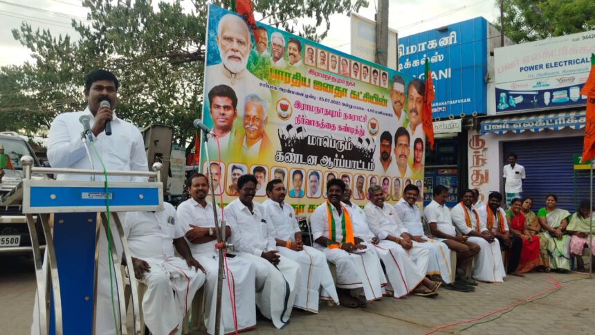 ராமநாதபுரம் நகர் பாரதிய ஜனதா கட்சி சார்பில் மக்களின் பல்வேறு பிரச்சனைகள் குறித்தும் நகராட்சியில் நடைபெற்ற நிர்வாக சீர்கேட்டை கண்டித்தும் அரண்மனையில் கண்டன ஆர்ப்பாட்டம் நடைபெற்றது. ஆர்ப்பாட்டத்தில் நகர் தலைவர் நாகராஜன் தலைமை வகித்தார். மாவட்ட பொதுச் செயலாளர் வக்கீல் சண்முகநாதன், கவுன்சிலர் குமார், முன்னாள் மாவட்ட தலைவர் இ.எம்.டி. கதிரவன் ஆகியோர் முன்னிலை வகித்தனர்.