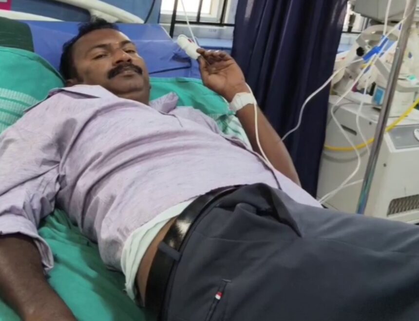 இதனால் மாரியப்பன் மயங்கி கீழே விழுந்தார். அருகில் இருந்த ஊழியர்கள் அவரை உடனடியாக மீட்டு சிகிச்சைக்காக கோவில்பட்டி அரசு மருத்துவமனையில் அனுமதித்துள்ளனர். அங்கு மாரியப்பன் சிகிச்சை பெற்று வருகிறார். இதற்கிடையில் அலுவலக ஊழியர்கள் மற்றும் தீயணைப்புத் துறையினர் மாரியப்பனை கடித்த பாம்பினை நீண்ட நேரம் தேடிப் பார்த்தனர்.