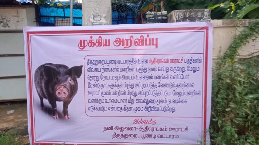 திருவாரூர் மாவட்டம் திருத்துறைப்பூண்டி வட்டாரத்திற்குட்பட்ட கிராம ஊராட்சிகளில் உள்ள விவசாய நிலங்களை நாசம் செய்யும் பன்றிகளை பிடிக்க திருத்துறைப்பூண்டி வட்டார வளர்ச்சி அலுவலர் உத்தரவு.
