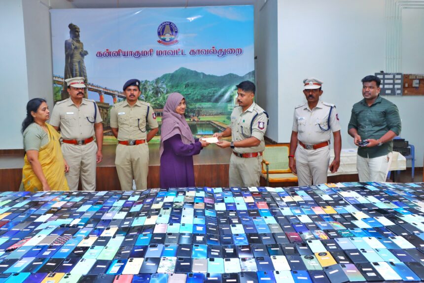 கன்னியாகுமரி மாவட்டத்தில் உள்ள அனைத்து காவல் நிலையங்களில் செல்போன் தொலைந்து போனதாக பல்வேறு மனுக்கள் பெறப்பட்டது. அந்த மனுக்கள் மீது உரிய நடவடிக்கை எடுக்க மாவட்ட காவல் கண்காணிப்பாளர் சுந்தரவதனம் உத்தரவிட்டார். எனவே சைபர் பிரிவு போலீசார் காணாமல் போன செல்போன்களை மீட்கும் பணியில் தொடர்ந்து தீவிரமாக ஈடுபட்டு வந்தனர். தொடர் நடவடிக்கையால் தற்போது சுமார் 1,90,00,000/- (ஒரு கோடி தொண்ணூறு லட்சம் ரூபாய்) மதிப்புள்ள 1000 செல்போன்கள் கண்டுபிடிக்கப்பட்டு மீட்கப்பட்டுள்ளது.