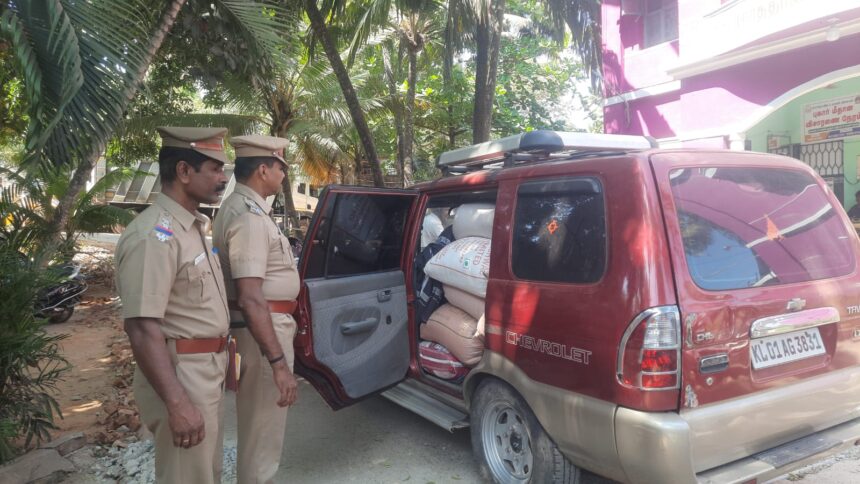 மார்தாண்டம் பேரூந்து நிலையம் அருகே மார்தாண்டம் காவல்நிலைய உதவி ஆய்வாளர் இந்து சூடன் தலைமையிலான போலீசார் வாகன தணிக்கையில் ஈடுபட்டு கொண்டிருந்தனர். அப்போது வேகமாக வந்த டவேரா சொகுசு வாகனத்தை நிறுத்த சைகை காட்டிய போது நிற்காமல் சென்றது. போலீசார் வாகனத்தை சுமார் இரண்டு கிலோமீட்டர் தூரம் துரத்தி மடக்கி பிடித்து சோதனை செய்த போது கறுப்பு துணியால் மூடப்பட்ட நிலையில் சிறு சிறு மூட்டை பைகளில் சுமார் இரண்டாயிரம் கிலோ ரேஷன் அரிசி இருப்பதை கண்டு பிடித்ததனர்.