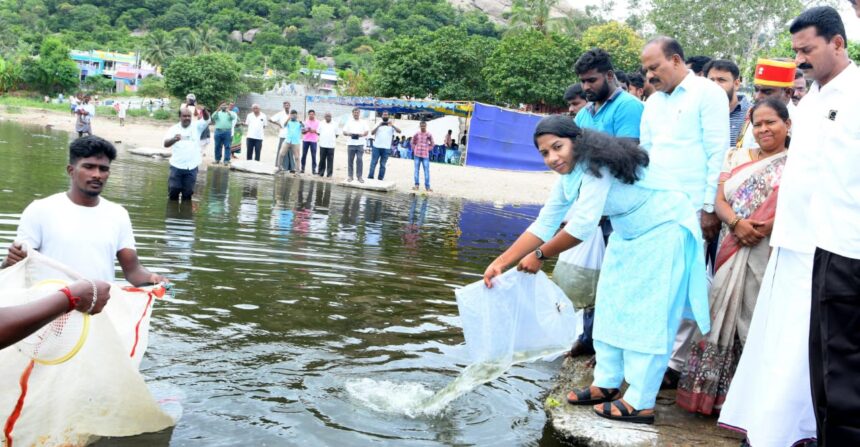 சேலம் மாவட்டம், மேட்டூர் அணை மீன் விதைப்பண்ணையிலிருந்து மீன் குஞ்சுகள் வாங்கி கிருஷ்ணகிரி அணை அரசு மீன்பண்ணையில் 45 நாட்கள் வளர்க்கப்பட்ட ரோகு, மிர்கால், கட்லா கல்லாசு மற்றும் சேல்கெண்டை உள்ளிட்ட 5 ரக மீன்குஞ்சுகள் 5 சென்டிமீட்டருக்கு மேல் வளர்ந்த நிலையில் அந்த மீன்குஞ்சுகள் தென்பெண்ணை மற்றும் காவிரி ஆற்றில் விட முடிவு செய்யப்பட்டுள்ளது. நடப்பாண்டிற்கு தென்பெண்ணை மற்றும் காவிரி ஆற்றில் 4 இலட்சம் மீன்குஞ்சுகள் விடும் பணி இன்று (26.09.2024) தொடங்கப்பட்டு, இன்று ஒரேநாளில் ரூ.3 இலட்சத்து 60 ஆயிரம் மதிப்பில் 2 இலட்சம் மீன்குஞ்சுகள் பெண்ணேஸ்வரமடம் தென்பெண்ணை ஆற்றில் விடப்பட்டது.
