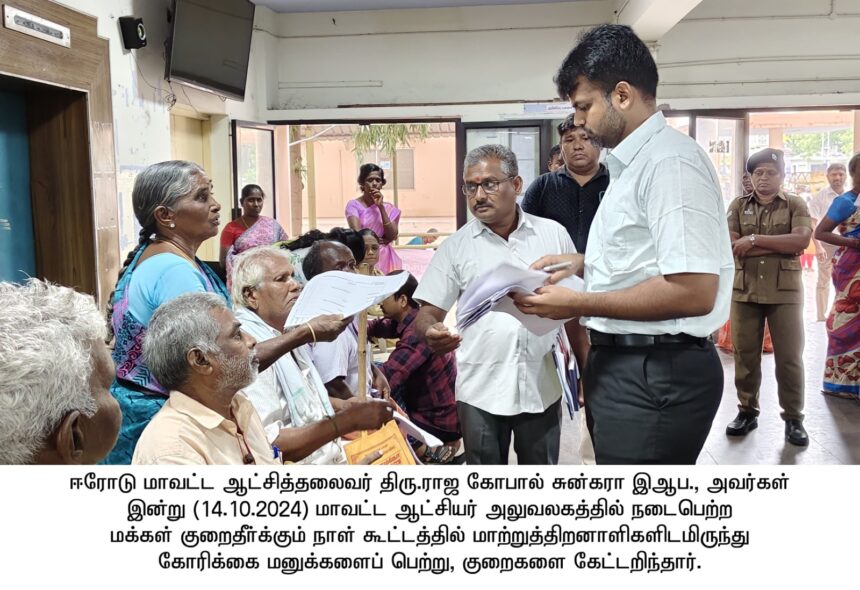 ஈரோடு மாவட்ட ஆட்சியரக கூட்டரங்கில், மக்கள் குறைதீர்க்கும் நாள் கூட்டம் மாவட்ட ஆட்சித்தலைவர் ராஜ கோபால் சுன்கரா தலைமையில் நடைபெற்றது.