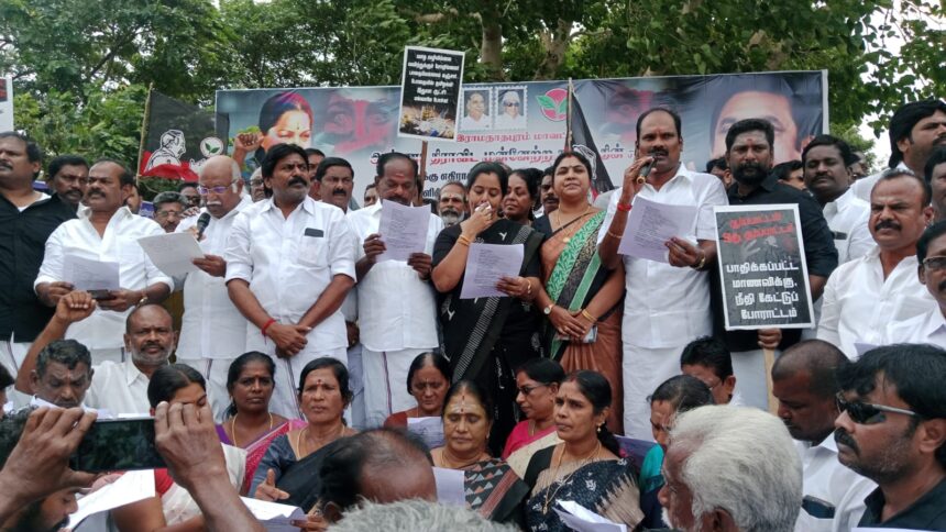 அண்ணா பல்கலை மாணவிக்கு இழைத்த அநீதியை கண்டித்து அதிமுக சார்பில் தடையை மீறி ராமநாதபுரத்தில் ஆர்ப்பாட்டம் நடந்தது. அதிமுக மாவட்ட செயலாளர் முனியசாமி தலைமை வகித்தார். அதிமுக மகளிரணி இணை செயலாளர் கீர்த்திகா முனியசாமி, முன்னாள் அமைச்சர் எம்பி அன்வர் ராஜா தலைமையில் கோஷங்கள் எழுப்பப்பட்டன.