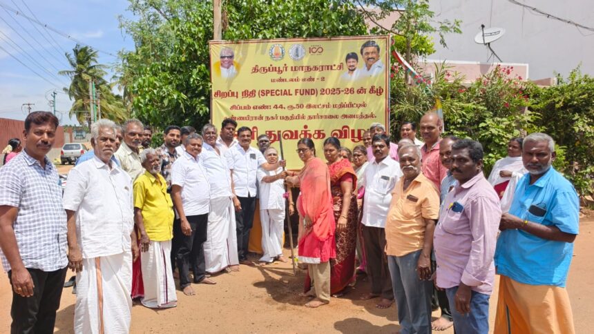 திருப்பூர் மாநகராட்சி மண்டலம் எண் 2 வார்டு எண் 8-ல் உள்ள கண்ணபிரான் நகர் பகுதியில் புதிய தார் சாலை சிறப்பு நிதி 2025-26ன் கிழ் 3 கோடி மதிப்பீட்டில் 36 தார் சாலை துவக்க விழா பணி நடைபெற்றது.