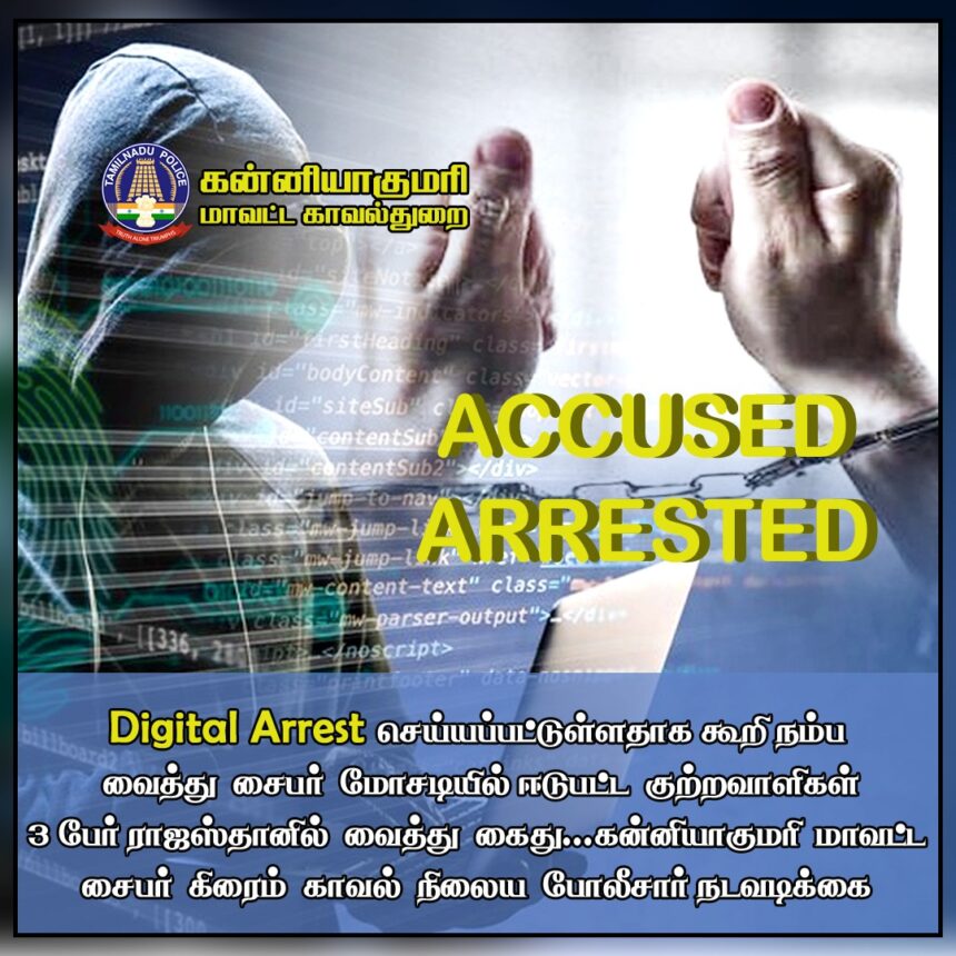 டிஜிட்டல் அரெஸ்ட் செய்யப்பட்டுள்ளதாக கூறி மிரட்டி ரூபாய் 70,00,000/- மற்றும் ருபாய் 26,54,047/- மோசடியாக பெற்றுக்கொண்டு தங்களை ஏமாற்றியதாக சைபர் கிரைம் காவல் நிலையத்தில் இரண்டு புகார் மனுக்கள் பெறப்பட்டதன் அடிப்படையில் சைபர் கிரைம் காவல் நிலையத்தில் வழக்குகள் பதிவு செய்யப்பட்டது. குற்றவாளிகளை உடனடியாக பிடிக்க மாவட்ட காவல் கண்காணிப்பாளர் ஸ்டாலின் உத்தரவிட்டிருந்தார்.