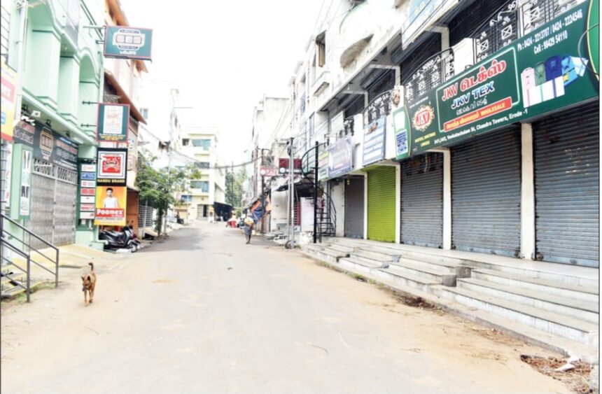 ஜவுளி சந்தைகள் சிறிய கடைகள் மற்றும் பெரிய ஜவுளி நிறுவனங்கள் வரை கடைகள் மூடப்பட்டு சாலை கள் வெறிச்சோடி காணப்பட்டன மஞ்சள் சந்தைகளும் மூட ப்பட்ட ன. மேலும்
