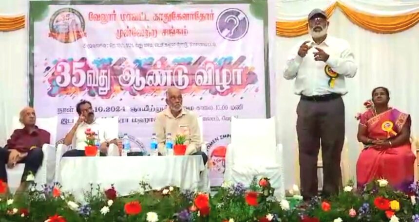 வேலூர் மாவட்டம் ,வேலூர் மாவட்ட காதுகேளாதோர் முன்னேற்ற சங்கம் சார்பில் நடைபெற்ற 35 ஆம் ஆண்டு விழா வேலூர் புதிய பேருந்து நிலையம் அருகில் உள்ள வி.டி.எம். சித்ரா மஹாலில் நடைபெற்றது இதில் சிறப்பு விருந்தினர் வேலூர் அரசு ரியல் எஸ்டேட் Rtnஞானசேகரன் கலந்துகொண்டு துவக்கி வைத்தார். சிறப்பு அழைப்பாளர்கள் தலைவர் எம். ரமேஷ், தமிழ்நாடு காதுகேளதோர் கூட்டமைப்பு சென்னை, பொன்னுசாமி பொதுச் செயலாளர் ,தமிழ்நாடு காது கேளாதோர் விளையாட்டு கவுன்சில் சென்னை சி. பிரிசிலா, தலைவர் இ. கே .ஜமால் அலி, தலைவர் சென்னை காது கேளாதோர் சங்கம் சைகைமொழி பெயர்ப்பாளர் ஆர். தேவிகாராணி மற்றும் சங்க ஆதரவாளர் வழக்கறிஞர் ஸ்ரீதர் ,சங்க ஆலோசகர் கே. ஆர். டெல்லி ,தலைவர் ஆர் .நரேஷ், அமைப்புச்செயலாளர் எம். சுரேஷ் குமார், பொருளாளர் பி. சுமதி ,துணை பொருளாளர் கே .கோபி ,மற்றும் வேலூர் மாவட்ட காது கேளாத முன்னேற்ற சங்கம் மாணவ ,மாணவி ,நிர்வாகிகள் வரவேற்பாளர்கள் ,விழாவில் கலந்து கொண்டனர் .இதில் காதுகேளாத பள்ளிக்கூடங்களில் சைகை மொழி சான்றிதழ் பெற்ற ஆசிரியர்களை பணியில் அமர்த்த வேண்டும் ,அரசு மாற்றுத்திறனாளி அலுவலகங்களில் வழங்கும் காது கருவிகள் தரமான துருப்பிடிக்காத நல்ல கருவிகளை வழங்க வேண்டும் என்றும் ,காக்ளியர் முறையில் காதுகளில் காது கருவி பொருத்தும் முறையை தடை செய்யு வேண்டும் எனவும் ,இந்த முறையில் மின்னல் மற்றும் மின்சாரம் தாக்கும் அபாயம் இருப்பதால் இதனை தடை விதிக்க வேண்டும் எனவும், அரசு வேலைவாய்ப்பில் 3 சதவீதத்தில் உள்ள மாற்று திறனாளிகளுக்கு 1 சதவீதம் வேலைவாய்ப்பு வழங்கிட வேண்டும் எனவும் ,மாதம் தோறும் உதவித் தொகையாக 6 ஆயிரம் ரூபாயாக உயர்த்தி வழங்கிட வேண்டும் ,மாதம் உதவித்தொகை 1500 ரூபாய் பெற்று வரும் காது கேளாத மக்களுக்கு மகளிர் உரிமைத் தொகை பெற வாய்ப்பு வழங்க வேண்டும் என்பன போன்ற தீர்மானங்கள் நிறைவேற்றப்பட்டன.
