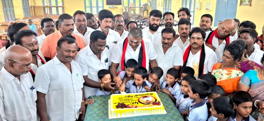 வேலூர் மாவட்டம் காட்பாடி தெற்கு பகுதி திமுக சார்பில் தமிழகத் துணை முதல்வர் உதயநிதி ஸ்டாலின் 47-வது பிறந்த நாளை முன்னிட்டு காட்பாடி சித்தூர் பேருந்து நிலையத்தில் உள்ள அண்ணா சிலைக்கு மாலை அணிவித்து கேக், பிரியாணி, பொதுமக்களுக்கு வேலூர் மாநகராட்சி துணை மேயரும் காட்பாடி தெற்கு பகுதி செயலாளருமான எம்.சுனில்குமார், வழங்கினார் அதேபோன்று பிற்பகல் 1:00 மணியளவில் காட்பாடி கசம் பகுதியில் உள்ள ஆதரவற்றோர் பள்ளி மாணவர்களுக்கு மத்திய உணவாக சுமார் 500க்கும் மேற்பட்டவர்களுக்கு பிரியாணி வழங்கி கேக் வெட்டி மாணவர்களுக்கு வழங்கினர் இதில் துரை சிங்காரம், காட்பாடி மாநகராட்சி 1-வது மண்டல குழு தலைவர் புஷ்பலதா வன்னியராஜா, காட்பாடி வடக்கு பகுதி செயலாளர் வன்னியராஜா, 12-வது வார்டு மாமன்ற உறுப்பினர் டிடா ரா. சரவணன், வட்டச் செயலாளர்கள் சசிகுமார், சம்பந்தம், வட்ட துணைச் செயலாளர் கே.பி.ராஜு பாய், மற்றும் பாண்டியன், தரணி, செந்தில்குமார், சேகர், ஒட்டல் சதீஷ், மற்றும் பொதுமக்களும் கட்சி நிர்வாகிகளும் திரளாக கலந்து கொண்டு பிறந்தநாள் விழாவை சிறப்பித்தனர்