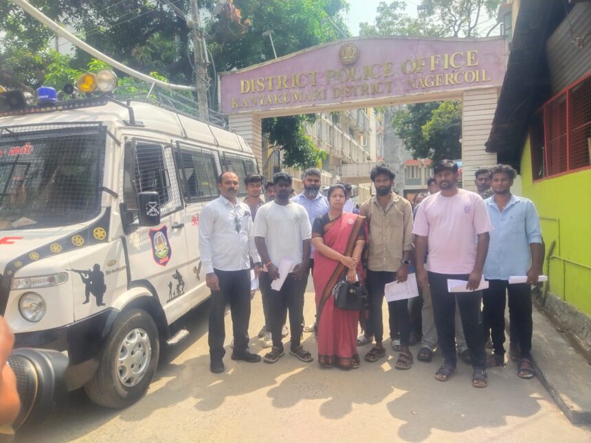 வெளிநாட்டில் வேலை வாங்கி தருவதாக கூறி படித்த இளைஞர்களிடம் ரூ.50 லட்சத்திற்கு மேல் ஏமாற்றியவர் மீது நடவடிக்கை எடுக்க வேண்டுமென நாம் தமிழர் கட்சி கன்னியாகுமரி தொகுதி மாவட்ட தலைவர் சாலோமன் தீபக் தலைமையில் மாவட்ட எஸ்.பி., சுந்தர வதனத்திடம் நாம் தமிழர் கட்சி நிர்வாகிகள் புகார் அளித்தனர்.
