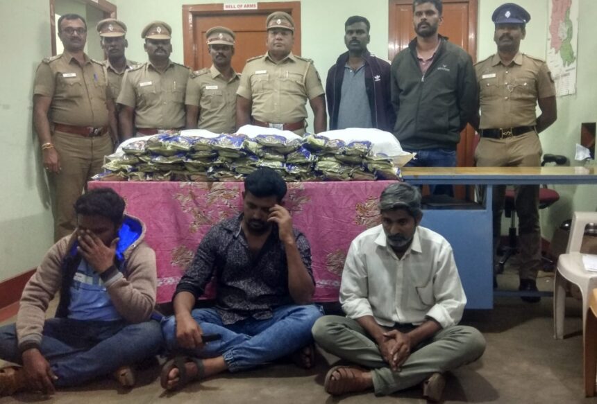 இந்நிலையில் கோத்தகிரி பகுதியில் குட்கா பொருட்கள் சமவெளி பகுதிகளில் இருந்து காய்கறி ஏற்றி வரும் சரக்கு வாகனங்களை சோதனை செய்தபோது ஒரு சரக்கு வாகனத்தில் மறைத்து வைக்கப்பட்டிருந்த அரசால் தடை செய்யப்பட்ட 3 ஆயிரம் குட்கா பாக்கெட்டுகள் 60 கிலோ இருந்தது கண்டுபிடிக்கப்பட்டது அதனைத் தொடர்ந்து வாகனத்தில் உள்ள மேட்டுப்பாளையத்தை சேர்ந்த முஜிப்பூர் ரஹ்மான் வயது 40,பாக்குமர தெருவை சேர்ந்த ஃபாருக் வயது 44 , சிறுமுகை ரோடு சந்தை கடை பகுதியை சார்ந்த முபாரக் அலி 34 ஆகிய மூவரை கைது செய்து கடத்தலுக்கு பயன்படுத்திய சரக்கு வாகனம் ஆகியவற்றை பறிமுதல் செய்து குட்கா கடத்திய மூவரையும் கோர்த்துகிரி மாஜிஸதிரட் முன்னிலையில் ஆஜர் படுத்தி சிறையில் அடைத்தனர்.