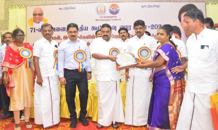 ராமநாதபுரத்தில் 71வது கூட்டுறவுவாரவிழா இராமநாதபுரத்தில் இன்று நடைபெற்ற 71-வது அனைத்திந்திய கூட்டுறவு வார விழாவில் பால்வளத்துறை அமைச்சர் ஆர்.எஸ்.ராஜகண்ணப்பன் கொண்டு பயனாளிகளுக்கு அரசு நலத்திட்ட உதவிகளை வழங்கி, சிறந்த கூட்டுறவு சங்கங்களுக்கு கேடயங்கள் வழங்கி பாராட்டினார் உடன் இராமநாதபுரம் மாவட்ட கழக செயலாளரும் சட்டமன்ற உறுப்பினருமான காதர்பாட்ஷா முத்துராமலிங்கம் இராமநாதபுரம் மாவட்ட ஆட்சித்தலைவர் பரமக்குடி சட்டமன்ற உறுப்பினர் செ.முருகேசன் அவர்கள் மற்றும் கூட்டுறவுசங்கங்களின் மாவட்ட இணைபதிவாளர் மற்றும் துணைப்பதிவாளர்கள் மேலும் கழக முன்னணி நிர்வாகிகள் பங்கேற்றனர்.