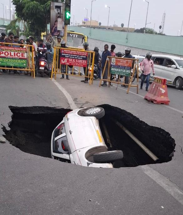 சாலையில் ஏற்பட்ட திடீர் பள்ளத்தில் கார் கவிழ்ந்த நிலையில், காரில் இருந்த கைக்குழந்தை உட்பட 5 பேர் பத்திரமாக மீட்பு; தரமணி சாலையில் கடும் போக்குவரத்து நெரிசல்.