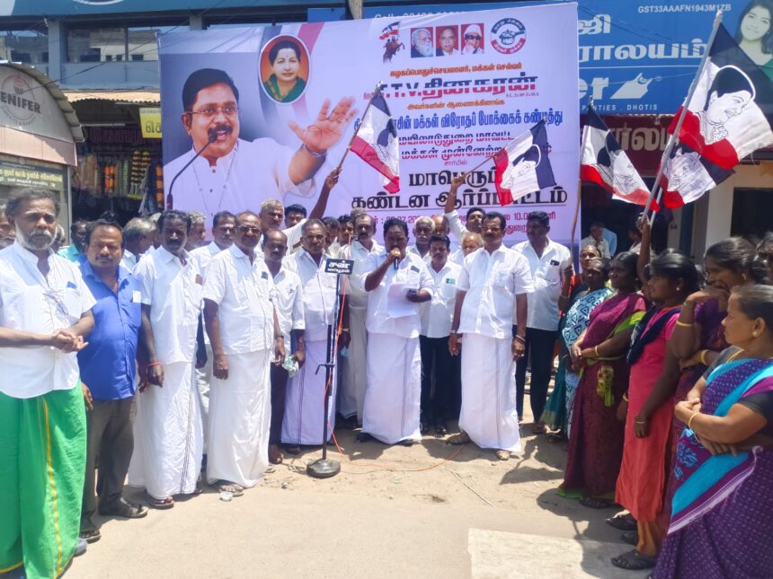 மயிலாடுதுறை கிட்டப்பா அங்காடி முன்பு மின் கட்டண உயர்வை கண்டித்து அ.ம.மு.க. சார்பில் கண்டன ஆர்ப்பாட்டம் நடந்தது. ஆர்ப்பாட்டத்திற்கு மாவட்ட செயலாளர் பாரிவள்ளல் தலைமை தாங்கினார். மாவட்ட அவைத்தலைவர் சாதிக் பாஷா, மாவட்ட துணை செயலாளர் கோகிலா, மாவட்ட இலக்கிய அணி செயலாளர் கோமல்கிட்டு மற்றும் மாவட்ட நிர்வாகிகள் முன்னிலை வகித்தனர். ஆர்ப்பாட்டத்தில், ஏழை-எளிய மக்கள், குறு, சிறு தொழில்கள் பாதிக்கும் வகையில் உயர்த்தப்பட்டுள்ள மின் கட்டணத்தை உடனே திரும்பப் பெற வேண்டும். மேலும் சொத்துவரி, குடிநீர் கட்டணம், பால் மற்றும் பால் பொருட்களின் விலை, அத்தியாவசியப் பொருட்களின் விலை, நிலங்களுக்கான வழிகாட்டி மதிப்பு, முத்திரைத்தாள் கட்டணம், சாலை வரி உள்ளிட்ட வரி உயர்வை உடனே குறைக்க வேண்டும். கர்நாடக காங்கிரஸ் அரசிடம் பேசி தமிழகத்திற்கு தேவையான காவிரி நீரை பெற்று தர வேண்டும் என்று வலியுறுத்தி முழக்கங்கள் எழுப்பினர்.