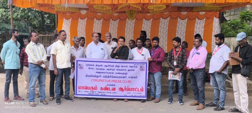 ஆம்பூரில் புவனம் நியூஸ் ஆசிரியர் மீது பொய் வழக்கு போட்ட ஆம்பூர் வருவாய் துறை அதிகாரிகளை கண்டித்து திருப்பத்தூர் பத்திரிகையாளர் சங்கம் சார்பாக கண்டன ஆர்ப்பாட்டம்
