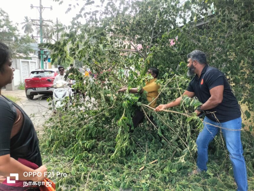 தொடர்ந்து மரம் முறிந்து விழுந்தது குறித்து நாகர்கோவில் மாநகராட்சி நிர்வாகத்திற்கு தகவல் தெரிவித்தார்.பின்னர்  நாம் தமிழர் கட்சி மாவட்ட தலைவர் தீபக் சாலமன்,மாவட்ட செய்தி தொடர்பாளர் விஜேஸ், நாகர்கோவில் தொகுதி நிர்வாகிகள் ஜாண்,ஷாஜி,நாகராஜ்,அருள் அஜித் ஆகியோர் போக்குவரத்திற்கு இடையூறாக சாலையில் கிடந்த மரக்கிளைகளை வெட்டி அகற்றினர்.
