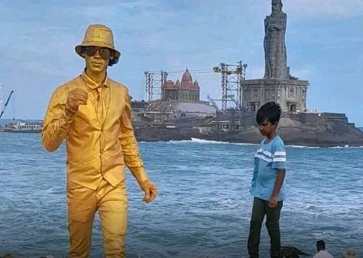 கன்னியாகுமரியில் முக்கடலும் சங்கமிக்கும் திரிவேணி சங்கமம் சங்கிலித் துறை கடற்கரை பகுதியில் வாலிபர் ஒருவர் தனது உடல் முழுவதும் தங்க முலாம் பூசி வெண்கல சிலை போல் நின்று பரபரப்பை ஏற்படுத்தினார். அனைவரையும் கவரும் வகையில் சுமார் 3 மணி நேரம் நின்ற அவரை சுற்றுலா பயணிகள் பலர் செல்பி எடுத்துச் சென்றனர். சிலர் அவரது செயலை பாராட்டி நன்கொடை அளித்தனர்.