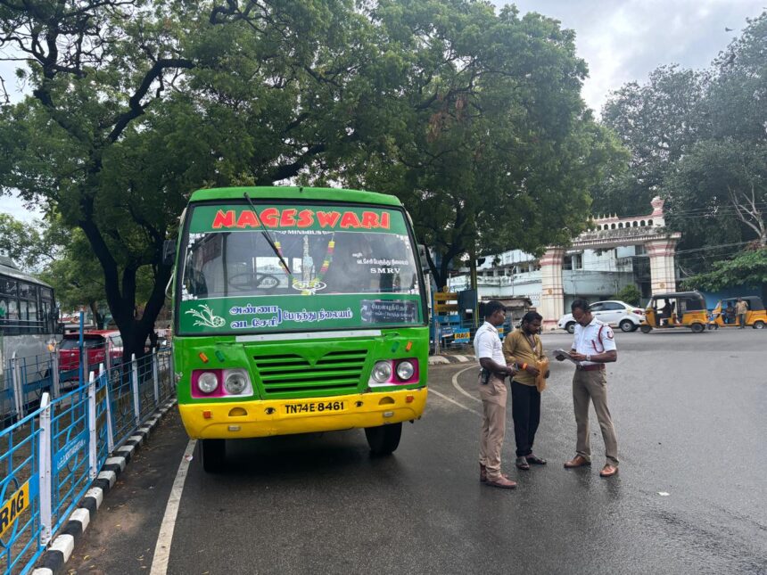 வாகன தணிக்கையில் ஈடுபட்டுக் கொண்டிருந்தனர். அப்போது அவ்வழியாக வந்த மினி பேருந்தின் ஓட்டுநர் செல்போன் பேசிக்கொண்டு வருவதைக் கண்டு தடுத்து நிறுத்தி ஓட்டுநரை பரிசோதித்ததில் ஓட்டுநர் மது போதையில் இருப்பது கண்டுபிடிக்கப்பட்டது.