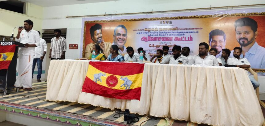 நடிகர் விஜய் தொடங்கியுள்ள தமிழக வெற்றிக்கழக கட்சியின் முதல் மாநில மாநாடு விழுப்புரம் மாவட்டம் விக்கிரவாண்டியில் வருகின்ற 27ஆம் தேதி நடைபெற உள்ளது. இந்நிலையில் மயிலாடுதுறை மாவட்டத்தில் தமிழக வெற்றிக் கழகத்தின் மாநாட்டிற்கு செல்வதற்கான ஆலோசனைக் கூட்டம் நடைபெற்று வருகிறது. அந்த வகையில் குத்தாலம் ஒன்றியம் மற்றும் பேரூராட்சி சார்பில் குத்தாலத்தில் உள்ள தனியார் திருமண மண்டபத்தில் ஆலோசனை கூட்டம் நடைபெற்றது. குத்தாலம் ஒன்றிய தலைவர் ராஜ்குமார் தலைமையில் நடைபெற்ற கூட்டத்தில் சிறப்பு அழைப்பாளராக மாவட்ட தலைவர் குட்டிகோபி கலந்து கொண்டு