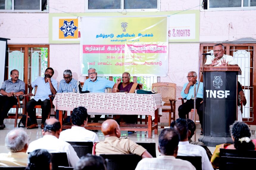 பைசல், ஆகியோர் வாழ்த்துரை ஆற்றினர். தமிழ்நாடு அறிவியல் இயக்கத்தின் மாநில துணைத் தலைவர் சசிக்குமார் , மாநில செயலர் ஜினிதா .ஆகியோர் முன்னிலை வகித்தனர்.