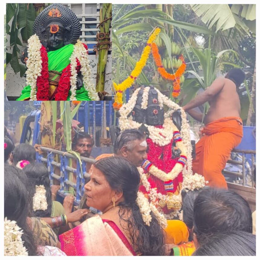 கோவிலில் பிரதிஷ்டை செய்யப்படும் மூன்று முகம் கொண்ட முத்தாரம்மன், உச்சினிமாகாளி அம்மன், சந்தனமாரியம்மன், மஞ்சள் மாரியம்மன், வெள்ளை மாரியம்மன், கால பைரவர், பைரவி, கருங்கிடாய்காரசாமி, செங்கிடாய்காரசாமி போன்ற சாமி கற்சிலைகள் மயிலாடி கல் சிற்ப கூடத்தில் சிறப்பு பூஜை செய்யப்பட்டு மேளதாளத்துடன் ஊர்வலமாக கோவிலுக்கு எடுத்து வரப்பட்டது.