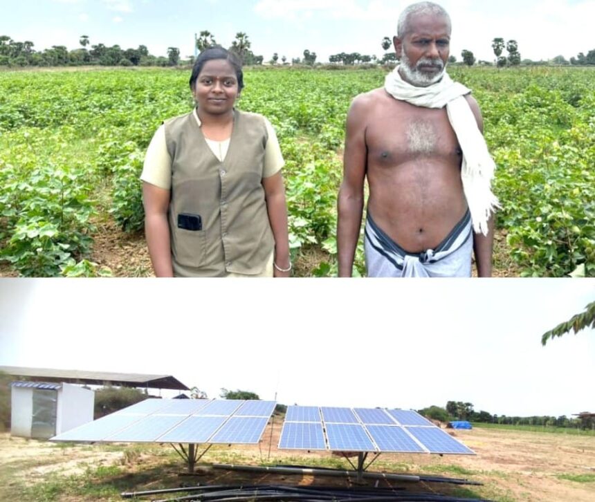 சூரிய சக்தியின் மூலம் பாசனம் செய்யும் நயினார்கோவில் விவசாயி பாஸ்கரன் உடன் வேளாண் கல்லூரி மாணவி இந்துஜா.
