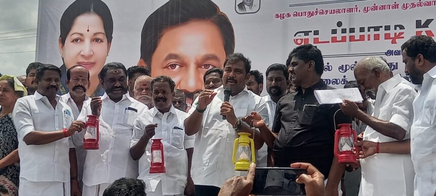 இந்த ஆர்ப்பாட்டத்தின் போது மாவட்ட அளவிலான அதிமுக நிர்வாகிகள் மின் கட்டண உயர்வை கண்டிக்கும் வகையில் தங்கள் கைகளில் அரிக்கேன் விளக்குகளை ஏந்தியவாறு கோஷங்கள் எழுப்பினர்.