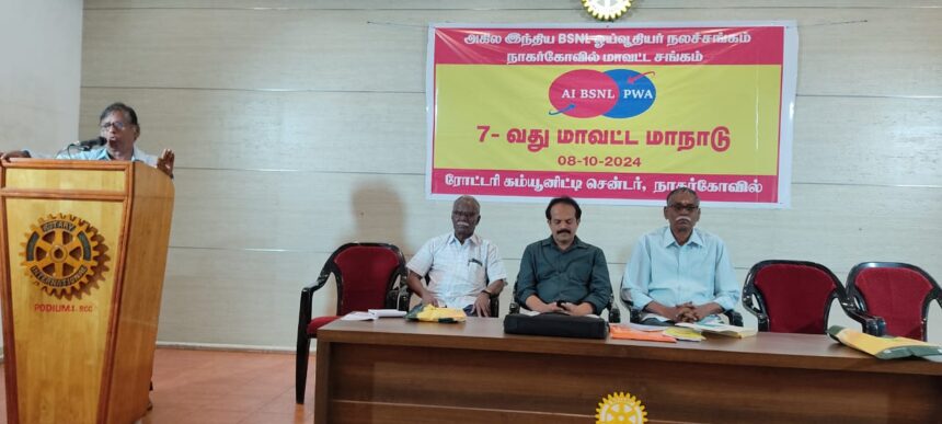 கன்னியாகுமரி மாவட்டம் நாகர்கோவில் மாவட்ட ஆட்சியர் அலுவலகம் அருகே அமைந்துள்ள ரோட்டரி கம்யூனிட்டி மையத்தில் வைத்து அகில இந்திய பி.எஸ். என்.எல் ஓய்வுதிய நலச்சங்க 7-வது மாவட்ட மாநாடு மாவட்ட தலைவர் ராஜன்பாபு தலைமையில் நடைபெற்றது.