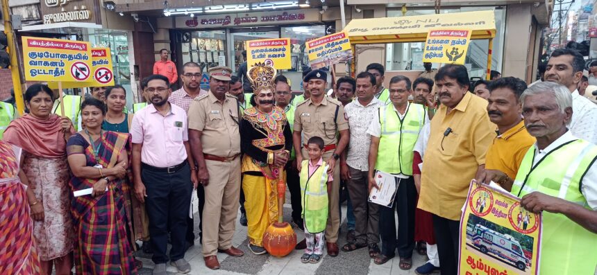 திருப்பூர் மாநகரத்தை பொருத்தமட்டில் காலை 8 மணி முதல் இரவு 10 மணி வரை போக்குவரத்து நெரிசல்கள் அதிகமாகவே காணப்படுகின்றது. இந்நிலையில் வாகன ஓட்டிகள் வாகனத்தை இயக்கும் பொழுது செல்போன்களை அதிகமாக பயன்படுத்துவதன் காரணமாக நாள்தோறும் விபத்துகள் அதிகரித்து வரும் சூழலில் விபத்துகளை தடுக்கும் வகையில் திருப்பூர் மாநகர காவல் ஆணையர். லட்சுமி உத்தரவின் பேரில் போக்குவரத்து காவல்துறையினர் பல்வேறு விதமான விழிப்புணர்வு பிரச்சாரங்களை மேற்கொண்டு வருகின்றனர். இந்நிலையில்  திருப்பூர் தெற்கு போக்குவரத்து காவல்துறை மற்றும் விபத்தில்லா திருப்பூர் தன்னார்வ தொண்டு சார்பில் வாகன ஓட்டிகளுக்கு செல்போன்களினால் ஏற்படும் விளைவுகள் குறித்தும் தலைக்கவசத்தின் அவசியம் குறித்தும் பொதுமக்களிடையே விழிப்புணர்வை ஏற்படுத்தும் நிகழ்ச்சி திருப்பூர் மாநகராட்சி அருகே மாநகர துணை ஆணையர் அசோக் கிரிஷ் யாதவ் தலைமையில் நடைபெற்றது. இந்த நிகழ்ச்சியில் எமன் வேடம் அணிந்த விழிப்புணர்வு தந்தை அப்பாவு என்பவர் பொதுமக்களுக்கு விழிப்புணர்வுகளை வழங்கினார்.