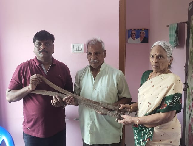 திருப்பத்தூர்:ஜூலை:31, திருப்பத்தூர் தூய நெஞ்சக் கல்லூரியின் தமிழ் துறை பேராசிரியர் முனைவர் க. மோகன் காந்தி வரலாற்று ஆசிரியர் காணி நிலம் முனிசாமி வாணியம்பாடியினை சேர்ந்த சித்த வைத்தியர் சீனிவாசன் ஆடியோ மேற்கொண்ட கள ஆய்வின் பழங்கால போர் வாள்கள் இரண்டினை கண்டெடுத்தனர்.