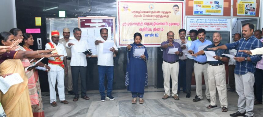கிருஷ்ணகிரி மாவட்ட ஆட்சியர் அலுவலக வளாகத்தில், தொழிலாளர் நலன் மற்றும் திறன் மேம்பாட்டுத்துறை சார்பாக, குழந்தைத் தொழிலாளர் முறை எதிர்ப்பு தினத்தினை முன்னிட்டு, குழந்தைத் தொழிலாளர் முறை எதிர்ப்பு தின உறுதிமொழியினை மாவட்ட ஆட்சித்தலைவர் .கே.எம்.சரயு ., அவர்கள் தலைமையில் அனைத்துறை அலுவலர்கள் எடுத்துக்கொண்டனர்.