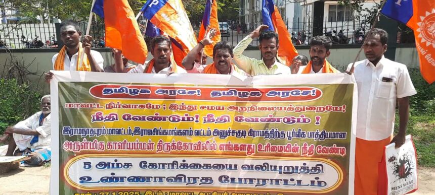 இந்து ஜனநாயக பேரவை தமிழகத் தலைவர் அண்ணாத்துரை, இந்து முன்னணி தேவகோட்டை நகர் தலைவர் சுரேஷ், நகர் பொதுச்செயலாளர் மாரியப்பன், இந்து ஜனநாயக பேரவை  இளைஞரணி திருவாடானை ஒன்றியத்தலைவர் தனுஷ் உள்ளிட்டோர் ராமநாதபுரம் மாவட்ட ஆட்சியரக வளாகத்தில் உண்ணாவிரதப் போராட்டத்திற்கு முயன்றனர். அனுமதி மறுக்கப்பட்டதையடுத்து மக்கள் குறை தீர் நாள் கூட்டத்தில் மாவட்ட ஆட்சியர் சிம்ரன் ஜீத் சிங் காலோனிடம்,  நீதிமன்ற தீர்ப்பின்படி கோயில் உரிமையை மீட்டுத் தர வேண்டும், கோயிலை ஆக்கிரமித்துள்ளோர்களால் அனுச்சக்குடி கிராம மக்களிடம் நிலவும் அச்சுறுத்தலை களைய உரிய நடவடிக்கை எடுக்க  வேண்டும்  முறையிட்டனர்.