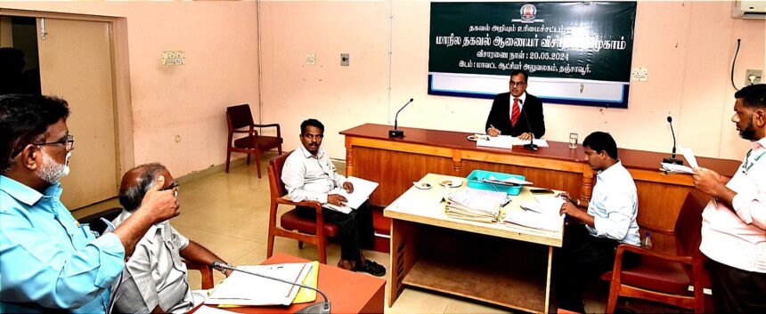 தகவல் அறியும் உரிமை சட்டத்தில் தங்களுக்கு தேவையான தகவல் களை பெற பொதுமக்கள் மனுக்க ள் தாக்கல் செய்வார்கள். இதில் அவர்களுக்கு தேவையான தகவ ல்களை முழுமையாக கிடைக்காத நிலையில் மேல் முறையீடு செய்வ து வழக்கம் .இந்த மேல் முறையிட்டு மனுக்களின் மீது விசாரணை நடத் தி உரிய தீர்வு வழங்கப்படும். அந்த வகையில் தஞ்சாவூர் மாவட்ட ஆட்சியர் அலுவலகத்தில் மாநில தகவல் ஆணையர் செல்வராஜ் தலைமையில் மனுதாரர்களின் மேல்முறையீட்டு மனு விவாதிக் கப்பட்டது. இதில் மாவட்ட ஆட்சியரி ன் நேர்முக உதவியாளர்கள் வெங்கடேசன் (வளர்ச்சி) பிரவீனாகுமாரி (பொது), மாநில தகவல் ஆணையரின் தொடர்பு அலுவலர் ராஜா ஆகியோர் கலந்து கொண்டனர்.
