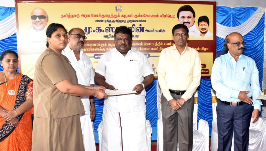 தமிழ்நாடு முதலமைச்சர் அவர்களின் வழிகாட்டுதலின் படி தமிழ்நாடு அரசு போக்குவரத்து கழகம் (கும்ப)லிட், கும்பகோணம் கோட்டத்தைச் சேர்ந்த திருச்சி, கும்பகோணம், நாகப்பட்டினம், கரூர், புதுக்கோட்டை மற்றும் காரைக்குடி ஆகிய 6 மண்டலங்களில் பணிபுரிந்த காலத்தில் மறைந்த பணியாளர்களின் 28 வாரிசுதார்களுக்கு பணி நியமன ஆணைகளை போக்குவரத்துத் துறை அமைச்சர் வழங்கினார். அதன்படி 4 மகளிர் நடத்துநர் உட்பட 25 நபர்களுக்கு நடத்துநர் பணிக்கான ஆணைகளையும், 2 ஓட்டுநர் பணிக்கான ஆணைகளையும் மற்றும் 1 தொழில்நுட்ப பணியாளர் பணிக்கான ஆணையினையும் வழங்கினார்.