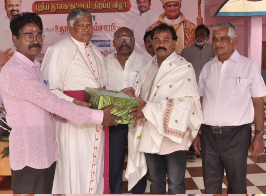 திண்டுக்கல் மாவட்டம், கொசவப்பட்டி புனித அந்தோணியார் மேல்நிலைப்பள்ளியில் நூலக திறப்பு விழாவில் நூலகத்திற்கு 500 புத்தகங்களை நன்கொடையாக வழங்கிய திண்டுக்கல் காஸ்மாஸ் லயன்ஸ் சங்கத்தின் உறுப்பினர் சீர்மிகு.Ln.N.தனுஷ்கோடி அவர்களின் சேவைகளை பாராட்டி மேதகு ஆயர் பி.தாமஸ்பால்சாமி அவர்கள் வாழ்த்துக்கள் தெரிவித்தார். அருகில் திண்டுக்கல் காஸ்மாஸ் லயன்ஸ் சங்கத்தின் புரவலர் Ln.M.திபூர்சியஸ், கொசவபட்டி புனித அந்தோனியார் மேல்நிலைப் பள்ளியின் தாளாளர் அருட்தந்தை ஐ.ஜான்சன் எடின்பர்க் மற்றும் பள்ளியின் உதவி தலைமை ஆசிரியர் வி. விசுவாச ராஜகுமார் ஆகியோர் உள்ளனர்.