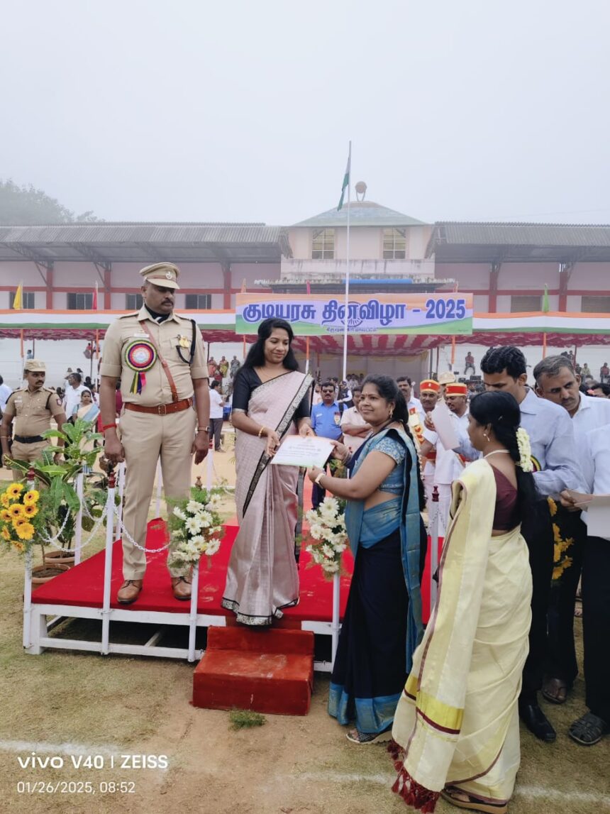 76 ஆவது குடியரசு தின விழாவில் சிறந்த கிராம நிர்வாக பணிக்காக காரப்பட்டு கிராம நிர்வாக அலுவலர் நித்யாவுக்கு மாவட்ட ஆட்சியர் கரங்களால் விருது வழங்கப்பட்டது