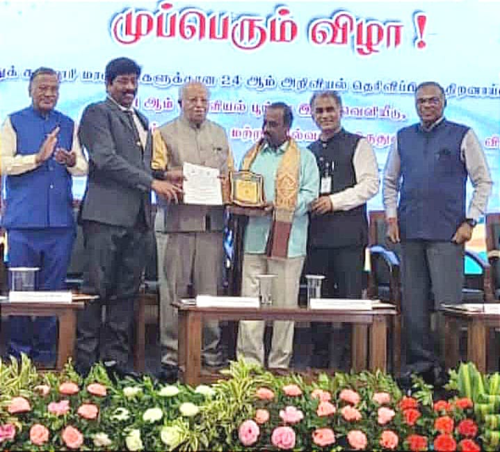 தூத்துக்குடி வ.உ. சிதம்பரம் கல்வி கழகசெயலர் சொக்கலிங்கத் துக்கு வாழ்நாள் சாதனையாளர் விருது, தஞ்சாவூர் தமிழ் பல்கலைக் கழக மொழி பெயர்ப்பு துறை முன்னாள் தலைவர் பழனி அரங்க சாமிக்கு பாவேந்தர் பாரதிதாசன் விருது, காரைக்குடி அழகப்பா பல்கலைக்கழக துணை வேந்தர் ரவி, திருச்சி பாரதிதாசன் பல்கலைகழக முன்னாள் துணை வேந்தர் மணிசங்கர் ,சிதம்பரம் அண்ணாமலைப் பல்கலைக்கழக அறிவியல் துறை முன்னாள் முதன்மையர் கபிலன், தஞ்சாவூர் மருத்துவக் கல்லூரி முன்னாள் பேராசிரியர் டாக்டர் நரேந்திரன், அகில இந்திய வானொலி முன்னா ள் இயக்குனர் முருகானந்தம் ஆகியோருக்கு அறிவியல் களஞ்சிய விருதும் ,மத்திய அரசின் அனைத்திந்திய தொழில்நுட்ப கல்வி குழுவின் சட்ட ஆலோசகர் ராமசாமி ,திருச்சி பாரதிதாசன் பல்கலைக்கழக பெக்ரூசா மைய இயக்குனர் பிரசன்னா, முனைவர் நடராஜமூர்த்தி, திருச்சி காவல் கண்காணிப்பாளர் செந்தில்குமார், மதுரை ஸ்ரீ மீனாட்சி நாட்டிய கலாலயாநிறுவனர் பிரேமா கருணாநிதி ஆகியோருக்கு அறிவு களஞ்சிய விருதுகளும் வழங்கப் பட்டன .இதையடுத்து தஞ்சாவூர் உலக திருக்குறள் பேரவை, திருவையாறு ஔவைக்கோட்டம், திருவையாறு பாரத இயக்கம், திருச்சிராப்பள்ளி தமிழிசை சங்கம் திருச்சி கோவிந்தம்மாள் தமிழ் மன்றம் ஆகியவற்றுக்கு திருக்குற ள் நெறிச்சுடர் விருதுகளும், வேதாரண்யம் கஸ்தூரி காந்தி கன்னியா குறிப்பிடம் இல்ல நிர்வா க அலுவலர் அப்பா குட்டி வேதரத்தி னம், தஞ்சாவூர் அருட்பெருஞ்ஜோதி நிறுவனர் தம்பையா ,தஞ்சாவூர் சித்தர் ஆசிரம நல வாழ்வு மைய நிறுவனர் சித்தர் ,அகத்தியர் மூலிகை உடலியக்க மருத்துவ மைய நிறுவனர் தட்சிணாமூர்த்தி, திருச்சி அமிர்தம் சமூக சேவை அறக்கட்டளை நிறுவனர் விஜய குமார் ஆகியோருக்கு சேவை செம்மல் விருதுகளும் வழங்கப் பட்டன.