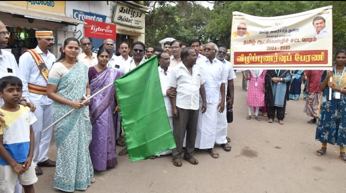 திருவாரூர் பழைய தொடர்வண்டி நிலையத்தில் தமிழ் வளர்ச்சித்துறையின் சார்பில் தமிழ் ஆட்சிமொழிச் சட்ட வாரம் குறித்த விழிப்புணர்வு பேரணியை மாவட்ட ஆட்சித்தலைவர் தி.சாருஸ்ரீ., கொடியசைத்து தொடங்கி வைத்தார்.