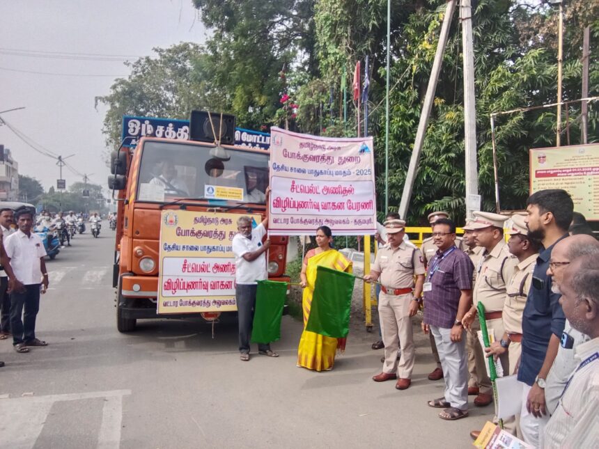 தருமபுரி மாவட்ட ஆட்சியர் அலுவலகம் முன்பு தேசிய சாலை பாதுகாப்பு மாதத்தை முன்னிட்டு தருமபுரி வட்டார போக்குவரத்து துறையின் சார்பில் சீட் பெல்ட் அணிதல், தலைக்கவசம் அணிதல் குறித்து விழிப்புணர்வு வாகன பேரணி மாவட்டக் காவல் கண்காணிப்பாளர் மகேஸ்வரன் தலைமையில், தருமபுரி வட்டார போக்குவரத்து அலுவலர் தாமோதரன் முன்னிலையில், மாவட்ட ஆட்சித் தலைவர் சாந்தி இப்பேரணியை கொடியசைத்து துவக்கி வைத்தார். வாகன ஓட்டிகளுக்கு தலைக்கவசம், சீட் பெல்ட் அணிவது குறித்து விழிப்புணர்வு ஏற்படுத்தும் நோட்டீஸ்களை மாவட்ட ஆட்சித் தலைவர் வழங்கினார்.