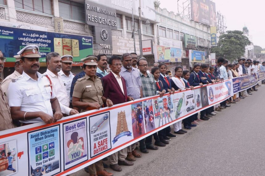 மதுரை இரயில்வே சந்திப்பு கிழக்கு நுழைவு வாயிலில் மதுரை மாநகர் போக்குவரத்து துணை ஆணையர் வனிதா தலைமையில் போக்குவரத்து விழிப்புணர்வு வாசகங்கள், விபத்து தவிர்ப்பு, விழிப்புணர்வு அடங்கிய படங்களை 150 அடி நீளத்திற்கு பிளக்ஸ் பேனரில் கல்லூரி மாணவர்கள் சாலையின் இருபுறமும் நின்று பொதுமக்களுக்கு விழிப்புணர்வு மற்றும் துண்டு பிரச்சுரம் வழங்கினர். இந்நிழ்ச்சியில் போக்குவரத்து உதவி ஆணையர் இளமாறன், போக்குவரத்து காவல் ஆய்வாளர் அ. தங்கமணி, மதுரை மேனேஜ்மென்ட் அஸோஸியேஷன் சண்முக சுந்தரம் மற்றும் பல்வேறு கல்லூரி பேராசிரியர்கள், மாணவர்கள் கலந்து கொண்டு விழிப்புணர்வு ஏற்படுத்தினர்.