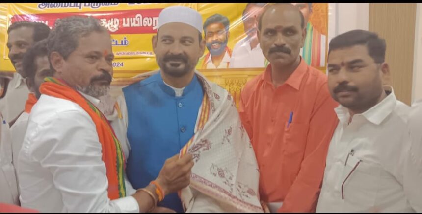 தேனி மாவட்ட ஆட்சியர் அலுவலகம் அருகே உள்ள கருவேல் நாயக்கன்பட்டி பகுதியில் அமைந்துள்ள பாரதிய ஜனதா கட்சி அலுவலகத்தில் நடந்த தேர்தல் குழு பயிலரங்கத்தில் தேனி மாவட்ட பாஜக நிர்வாகிகளுக்கு மத்தியில் ஆளும் பாஜக அரசின் சாதனைகளையும் மக்களிடம் எடுத்து எவ்வாறு கூறி மக்களிடம் பாஜக கட்சியை எப்படி வளர்க்க வேண்டும் என்பது குறித்து கட்சி நிர்வாகிகளுக்கு வழிகாட்ட வருகை தந்த பாஜக தேசிய சிறுபான்மை அணி பொதுச்செயலாளர் வேலூர் இப்ராஹிம்க்கு சின்னமனூர் நகர பாஜக சார்பில் அதன் நகரத் தலைவர் அ. லோகந்திர ராஜன் சால்வை அணிவித்து மரியாதை செய்தார் உடன் தேனி மாவட்ட பாஜக மாவட்ட நகர ஒன்றிய பேரூர் மற்றும் ஊரக பாஜக நிர்வாகிகள் ஏராளமானோர் உடன் இருந்தனர்