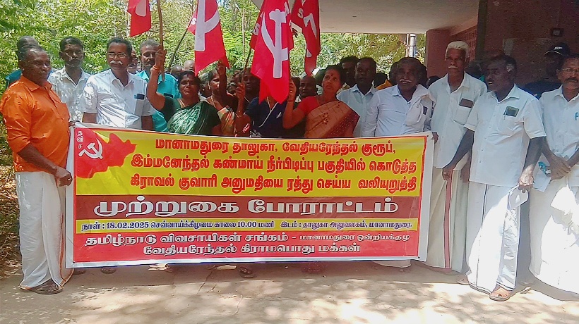சிவகங்கை மாவட்டம், மானாமதுரை தாலுகா வேதியரேந்தல் குரூப் இம்மானேந்தல் நீர் பிடிப்பு பகுதியில் கிராவல்குவாரி அமைக்க வழங்கிய அனுமதியை ரத்து செய்ய வலியுறுத்தி மானாமதுரை தாலுகா அலுவலகத்தில் தமிழ்நாடு விவசாயிகள் சங்கம் சார்பில் முற்றுகை போராட்டம் நடைபெற்றது.