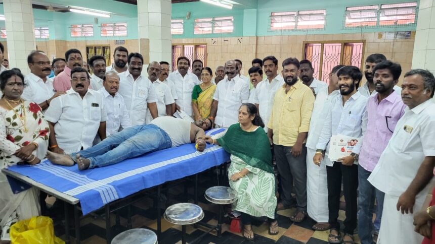 காஞ்சிபுரம் மாவட்டம் அதிமுக தகவல் தொழில்நுட்பப் பிரிவு சார்பில் பொதுச் செயலாளர் எடப்பாடி கே.பழனிச்சாமி பிறந்த நாள் விழாவை முன்னிட்டு அதிமுக மாவட்ட செயலாளர் வி. சோமசுந்தரம் தலைமையேற்று ரத்த தானம் வழங்கி முகாமினை துவக்கி வைத்தார்.