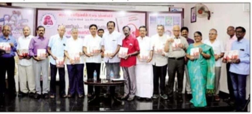 விழாவில் முன்னாள் அமைச்சர் என்.கே.கே.பி. ராஜா   புத்தகத்தை வெளியிட அதை மக்கள் சிந்தனை பேரவை தலைவர் ஸ்டாலின் குணசேகரன்