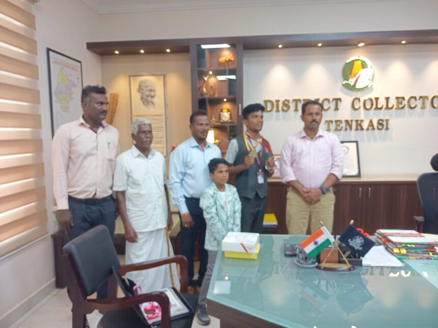 தேசிய அளவில் நடைபெற்ற டேக்வாண்டோ போட்டியில் வெண்கல பதக்கம் பெற்ற மாணவனுக்கு தென்காசி மாவட்ட ஆட்சியர் கமல் கிஷோர், மாவட்ட காவல் கண்காணிப்பாளர் சீனிவாசன் ஆகியோர் பாராட்டு தெரிவித்தனர்.