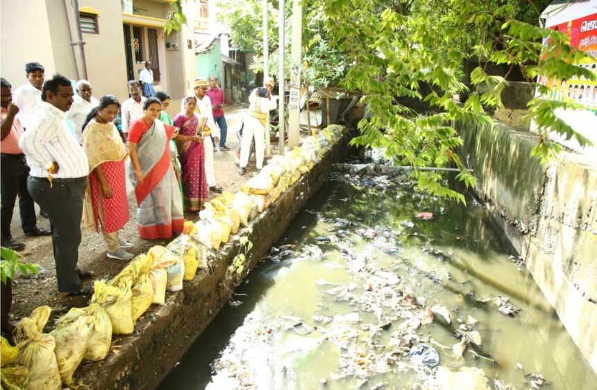 மதுரை மாநகராட்சி பீ.பீ.குளம் இந்திரா நகர் பகுதியில் உள்ள கால்வாய் சுத்தம் செய்யும் பணிகள் குறித்து மேயர் இந்திராணி பொன்வசந்த், மதுரை மாவட்ட ஆட்சித் தலைவர் மா.சௌ.சங்கீதா, மாநகராட்சி ஆணையாளர் ச.தினேஷ் குமார், ஆகியோர் நேரில் பார்வையிட்டு ஆய்வு மேற்கொண்டனர் அருகில் மாவட்ட வருவாய் அலுவலர் சக்திவேல், வருவாய் கோட்டாட்சியர் ஷாலினி, மண்டலத் தலைவர் சரவணபுவனேஸ்வரி, மாமன்ற உறுப்பினர் விஜயமௌசுமி மற்றும் அதிகாரிகள் ஆகியோர் உடன் உள்ளனர்.