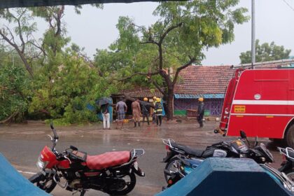 மண்டலமாணிக்கத்தில் மழையின் போது வீட்டின் மரம்விழுந்தது தீயணைப்புவீரர்கள் வந்து மரத்தை அறுத்து அகற்றினர்